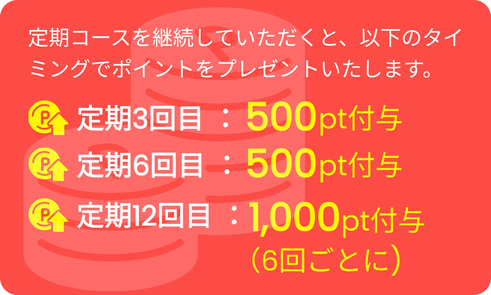 このたび、定期購入をご継続いただいているお客様へ、感謝の気持ちを込めて継続特典ポイント制度をご用意しております。